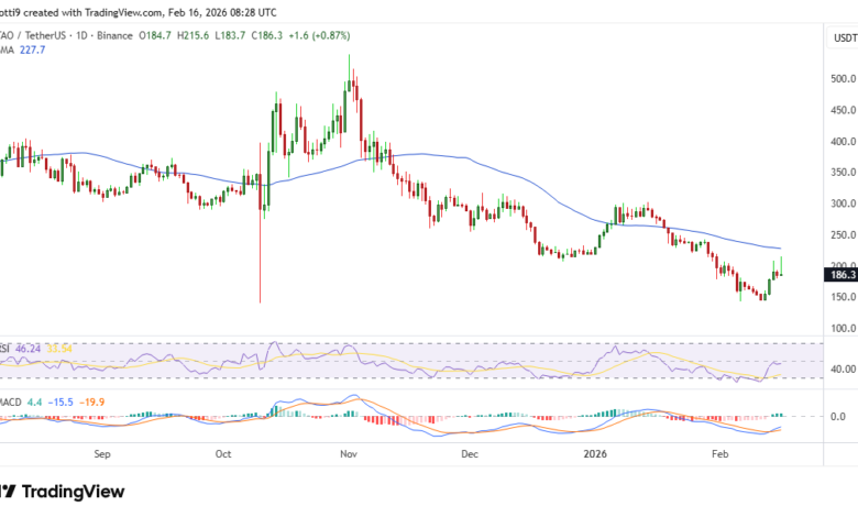 At the time of writing, TAO traded around $185, slightly off intraday highs and about 2% down in the past 24 hours.
