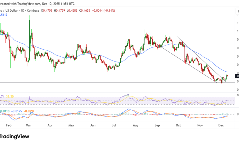 ADA’s uptick in the previous session extended to early trading on December 10 as an 11% push over 24 hours helped prices climb to $0.48.
