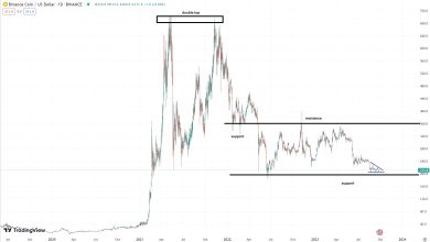 Binance Coin forms a descending triangle above important support area 2023 gains are gone A break below $200 should trigger…