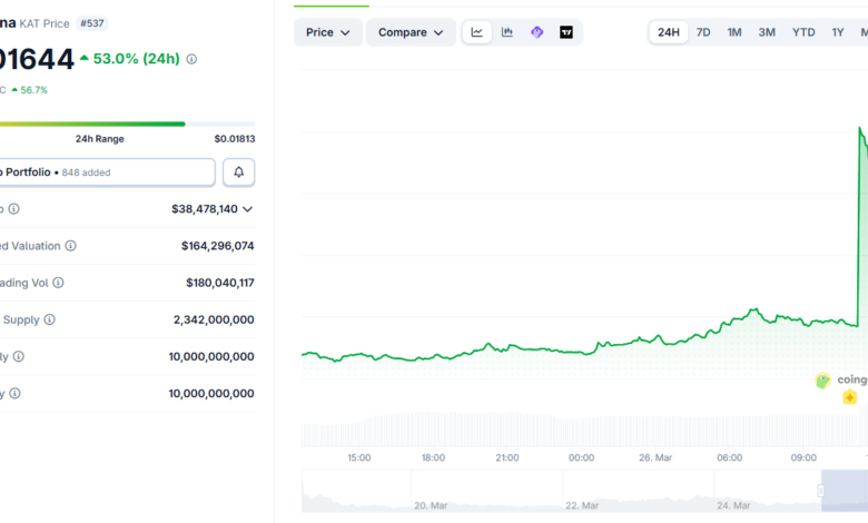 Katana (KAT), the native token of the Katana Network, has seen an extraordinary 53% price surge today, largely fueled by major cryptocurrency exchange listings.